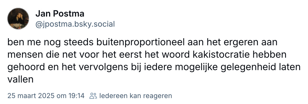 Een woord dat je sinds de herverkiezing van Donald Trump steeds vaker voorbij ziet komen is kakistocratie – letterlijk: ‘regering door de slechtsten’. Het is een moderne samenvoeging van twee Oudgriekse woorden: κάκιστος (kakistos, ‘slechtste’) en κράτος (kratos, ‘regering’).