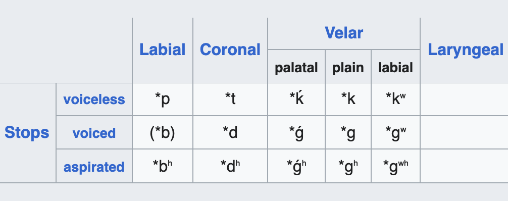 Hopelijk is mijn punt duidelijk: het is erg moeilijk om aan de hand van de verschillende dochtertalen een Proto-Indo-Europese *b te reconstrueren. Dat is vreemd, want daardoor ontstaat er een hiaat in een anderszins perfect symmetrisch systeem.